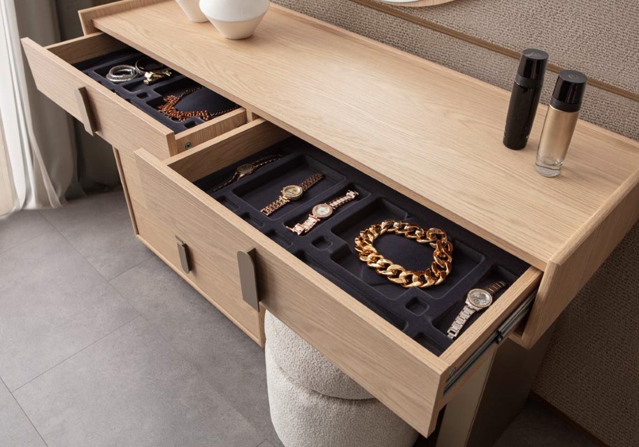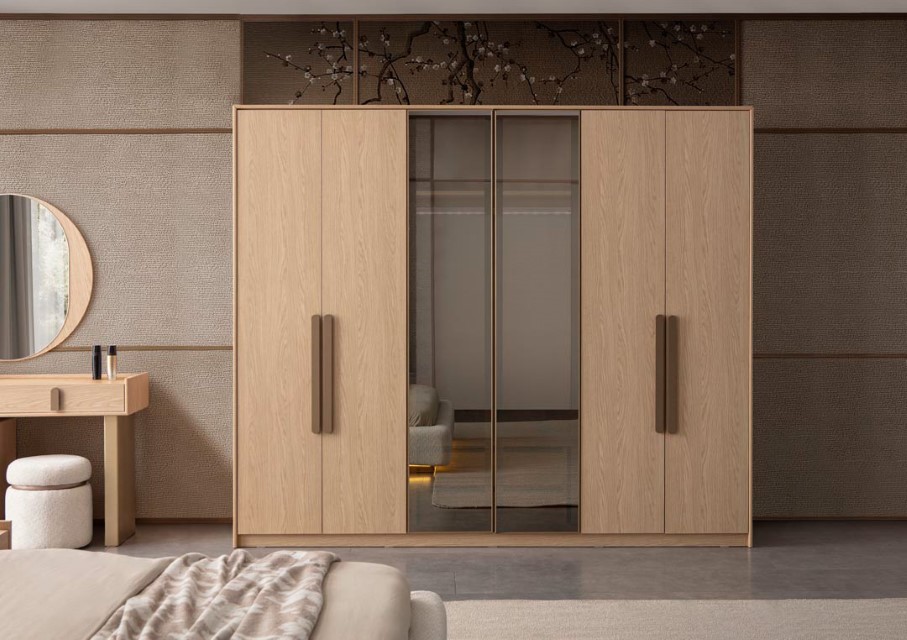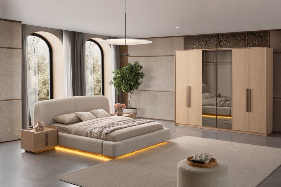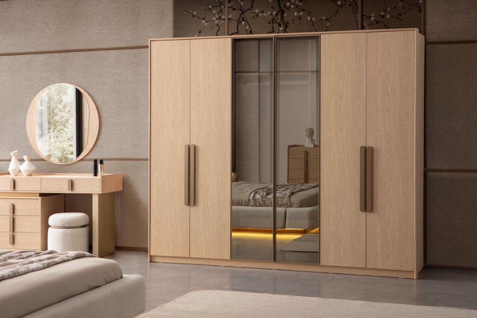 Genis hacimli gardirop, ayna detaylari ve zarif karyolasi sayesinde hem fonksiyonel hem de estetik bir kullanım sunar.