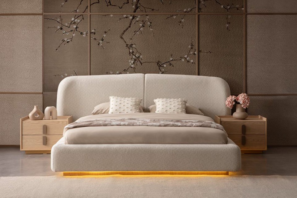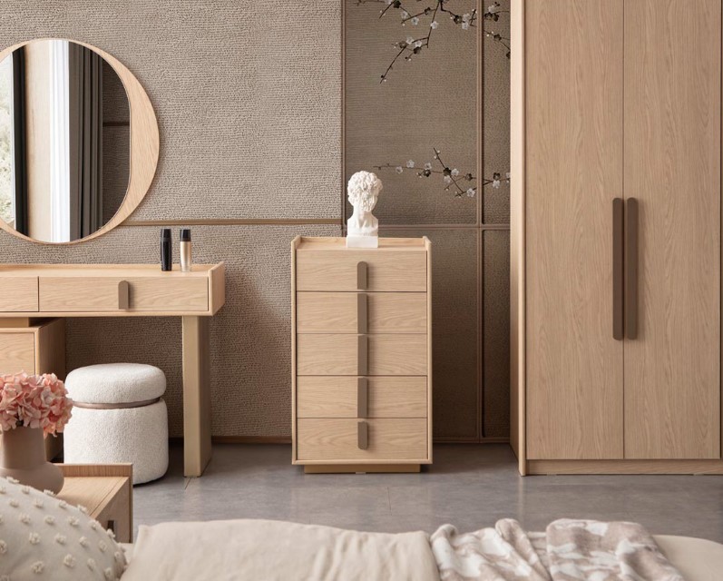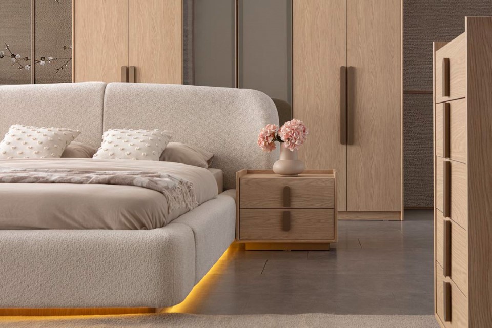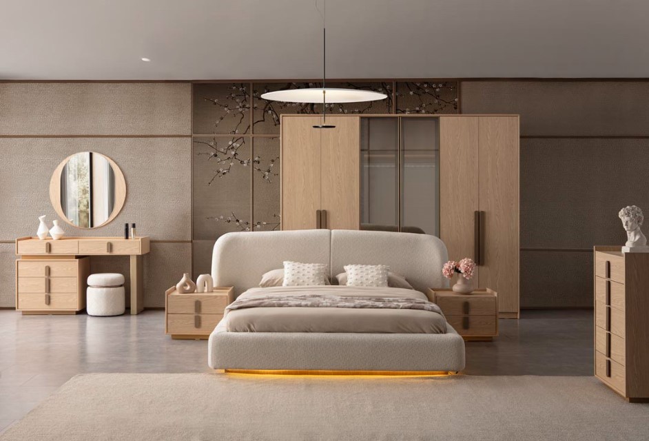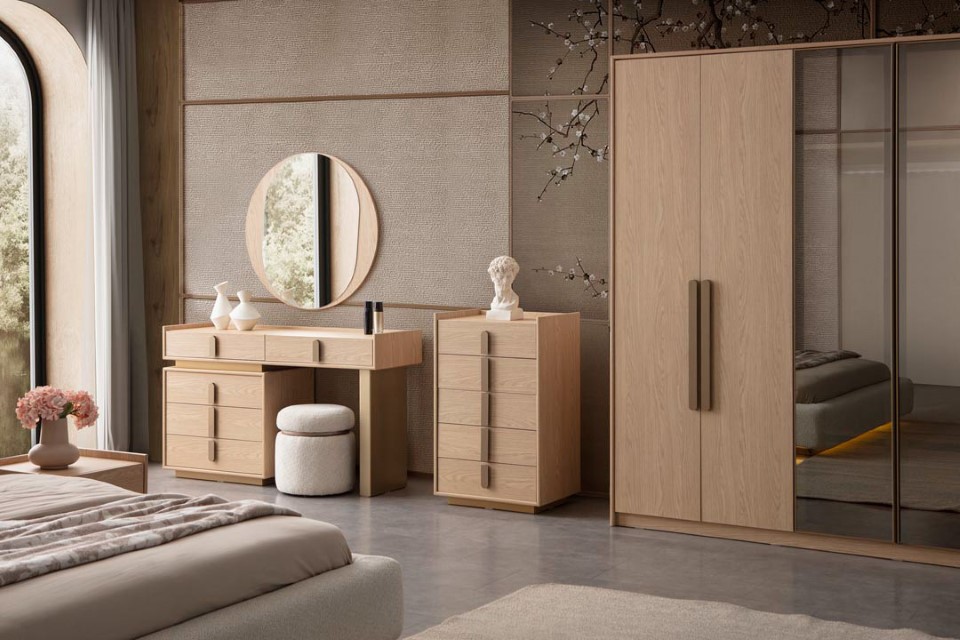 Armegeda Asya Yatak Odasi Takimi, modern cizgilere sahip dogal ahsap dokusuyla sicak ve huzurlu bir atmosfer yaratir.
