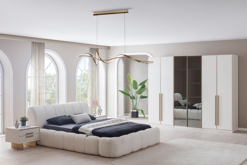 Genis depolama alanina sahip gardirop, konforlu karyola ve fonksiyonel makyaj masasiyle hem estetik hem de kullanisli bir tasarim sunar.