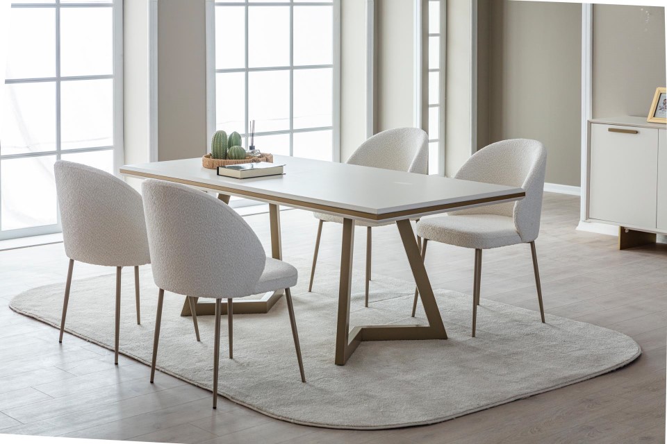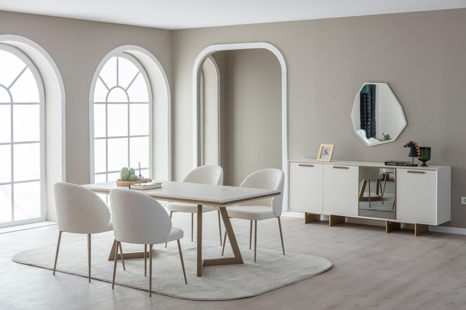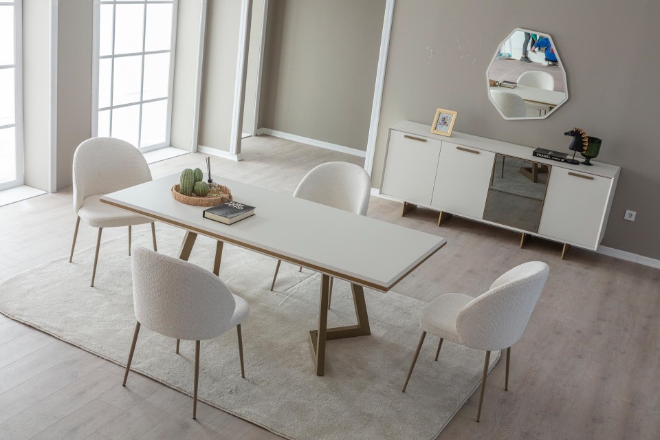 Valore Yemek Odası Takımı, modern yaşam tarzına uygun çizgileriyle estetik ve konforu bir araya getiriyor. Açık renkleri sayesinde ferah bir ambiyans yaratan takım; geniş yemek masası, konforlu sandalyeleri ve şık aynalı konsolu ile yemek odanıza sofistike bir görünüm kazandırır.